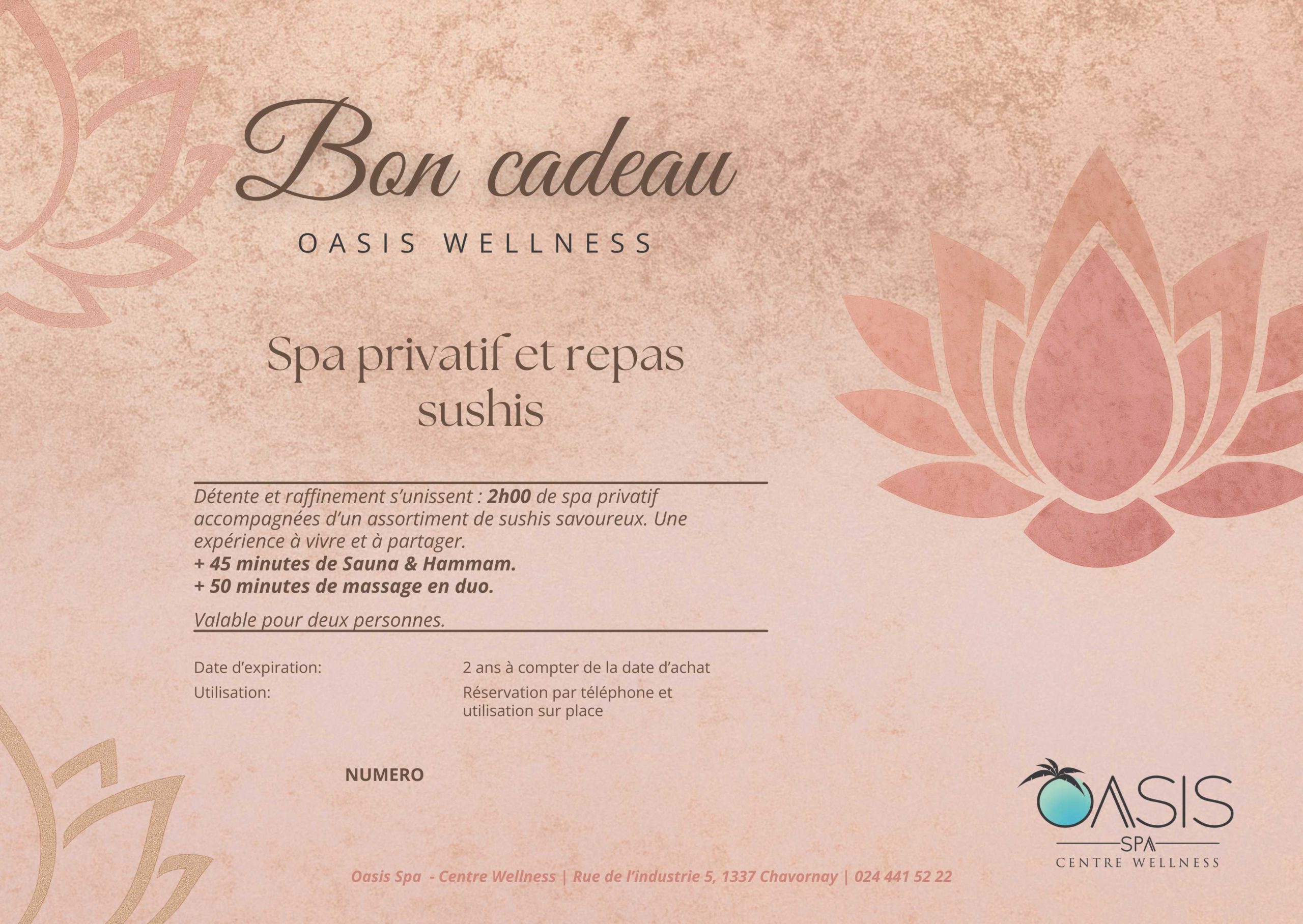 Après avoir réservé, veuillez présenter ce bon cadeau au moment de l’utilisation dans le spa Oasis Wellness. Il ne sera pas remboursé et ne peut être échangé contre de l’argent comptant. Les conditions générales de vente s’appliquent. »